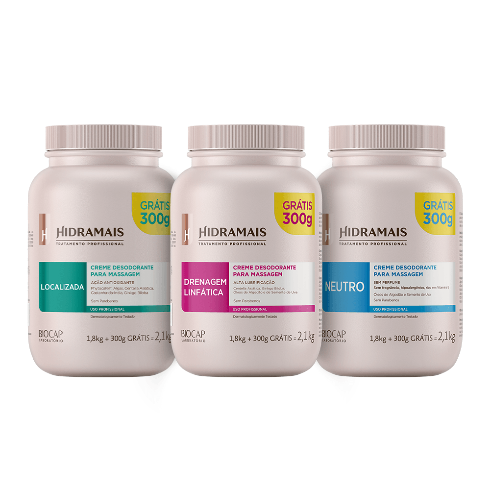 | O que é ? | Definição: Conjunto profissional de três cremes de massagem corporal em grandes embalagens (potões), desenvolvidos para atender a uma variedade de protocolos de massoterapia e estética. Composição do Kit: 1 Pote de Creme Neutro + 1 Pote de Creme Drenagem + 1 Pote de Creme Localizada. Rendimento: Alto rendimento, ideal para uso frequente em clínicas e spas. |